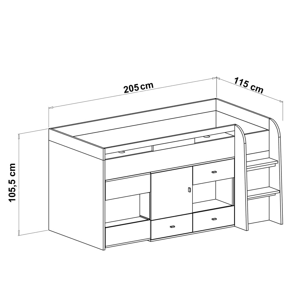 MOBY hoogslaper voor 1 persoon en kinderen met een bureau en een kledingkast in een modern ontwerp. Dankzij verschillende compartimenten is het bed praktisch en zeer veilig dankzij de stabiele constructie. Bij de productie hebben we een hoogwaardige laminaatplaat gebruikt die krasbestendig en ongevoelig is voor zonlicht. Dankzij universele kleuren past het bed perfect in elke kinderkamer.