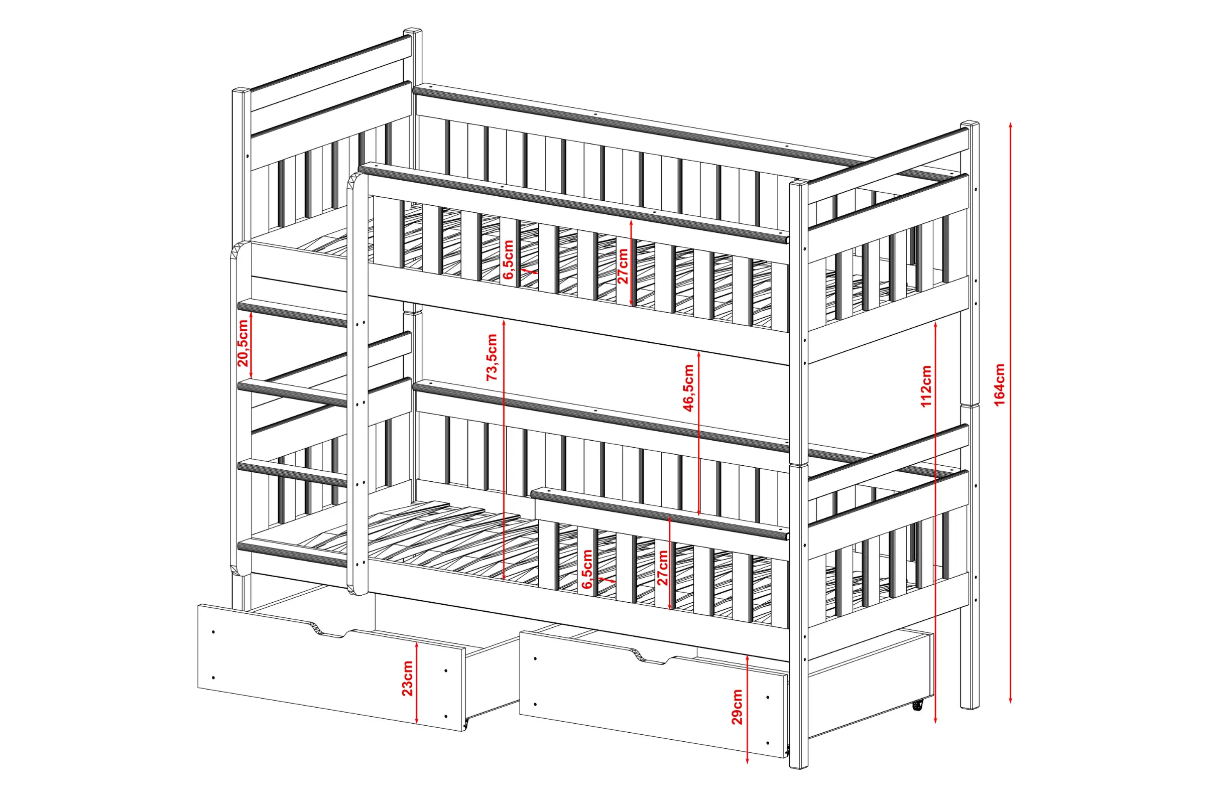 Het Stapellbed TIM 90x200 is de ideale ruimtebesparende oplossing voor broers en zussen die een kamer delen. Het combineert functionaliteit met een aantrekkelijk ontwerp en is perfect voor kleinere ruimtes, doordat het net zoveel ruimte in beslag neemt als een eenpersoonsbed. De robuuste constructie van massief dennenhout zorgt voor stabiliteit en veiligheid, terwijl de geïntegreerde lades extra opbergruimte bieden.