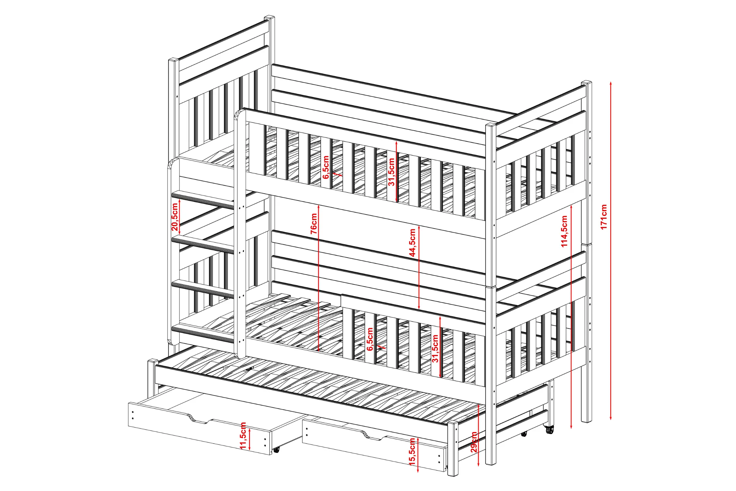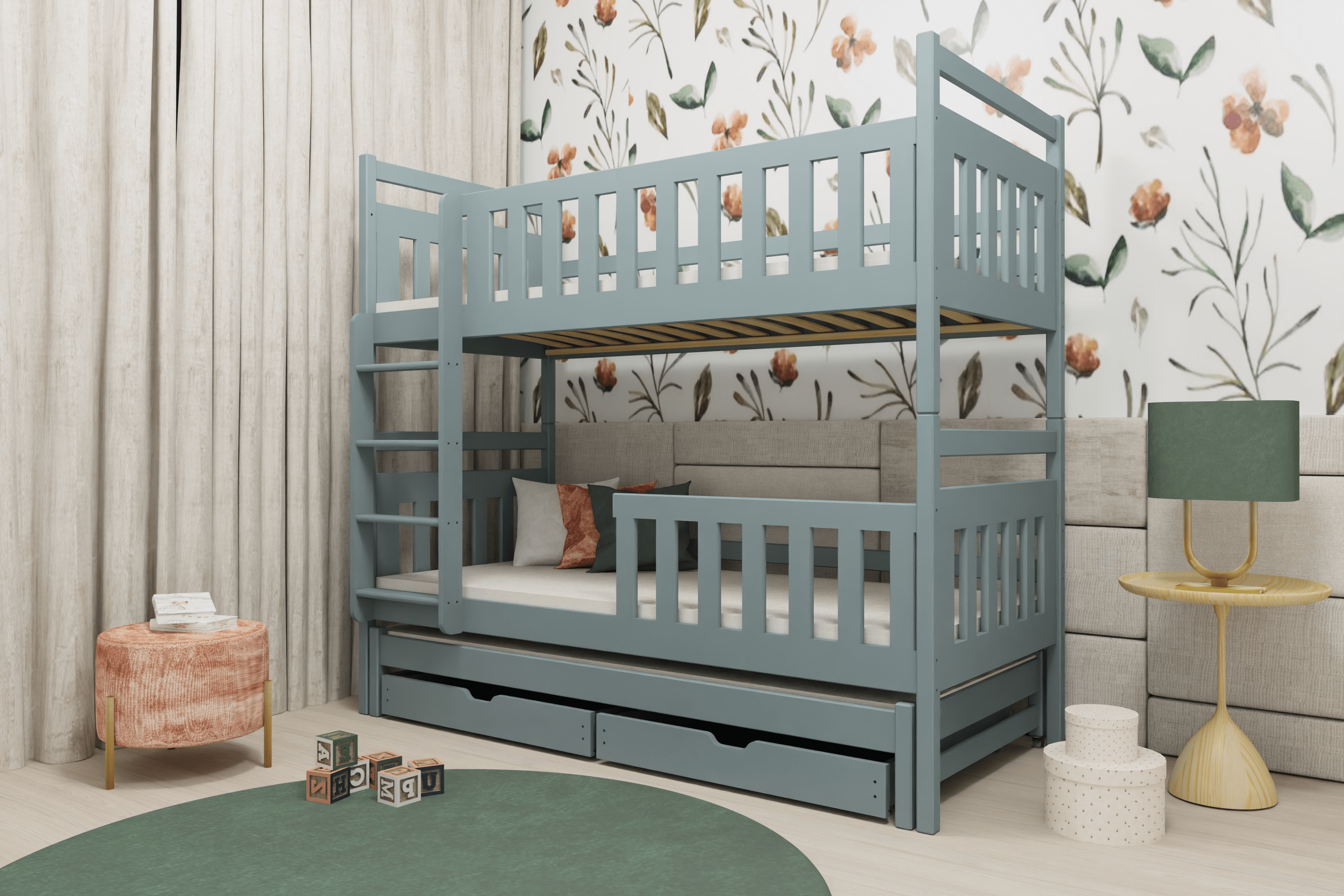 Het stapelbed KAJA 90x200 is de ideale oplossing voor gezinnen met drie kinderen die op zoek zijn naar een ruimtebesparend en functioneel bed. Het bed biedt plaats aan drie personen en past perfect in kleinere ruimtes, aangezien het de ruimte van een eenpersoonsbed inneemt. Gemaakt van massief grenenhout biedt het stabiliteit en veiligheid, ideaal voor broers en zussen.