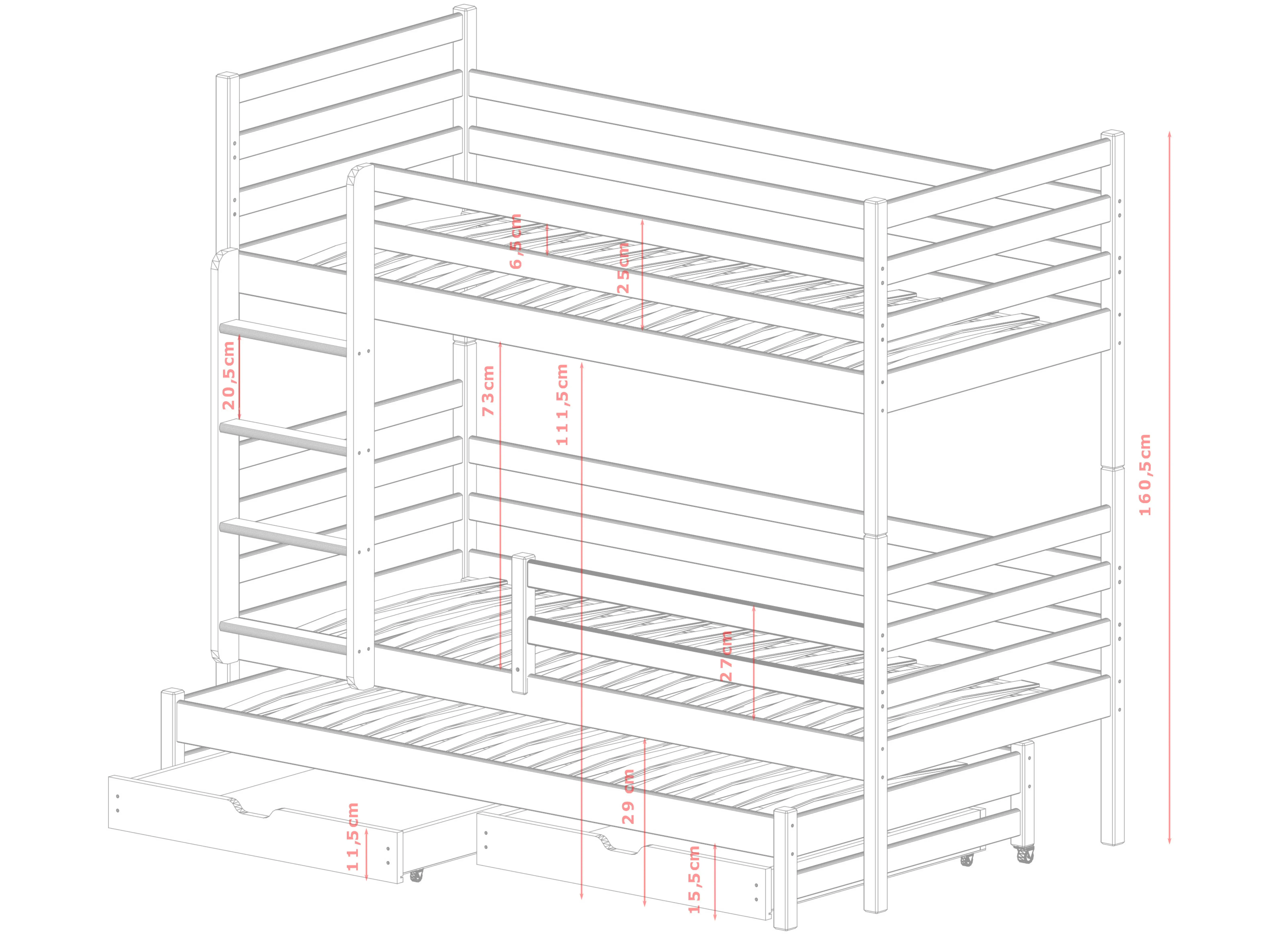 Het stapelbed LEON 90x200 is de ideale oplossing voor gezinnen met drie kinderen. Met zijn stevige grenenhouten constructie en praktisch ontwerp biedt het drie comfortabele slaapplaatsen, inclusief een uitschuifbaar bed voor extra flexibiliteit. Het stapelbed is perfect voor kleinere kamers en helpt ruimte te besparen zonder concessies te doen aan comfort en veiligheid.